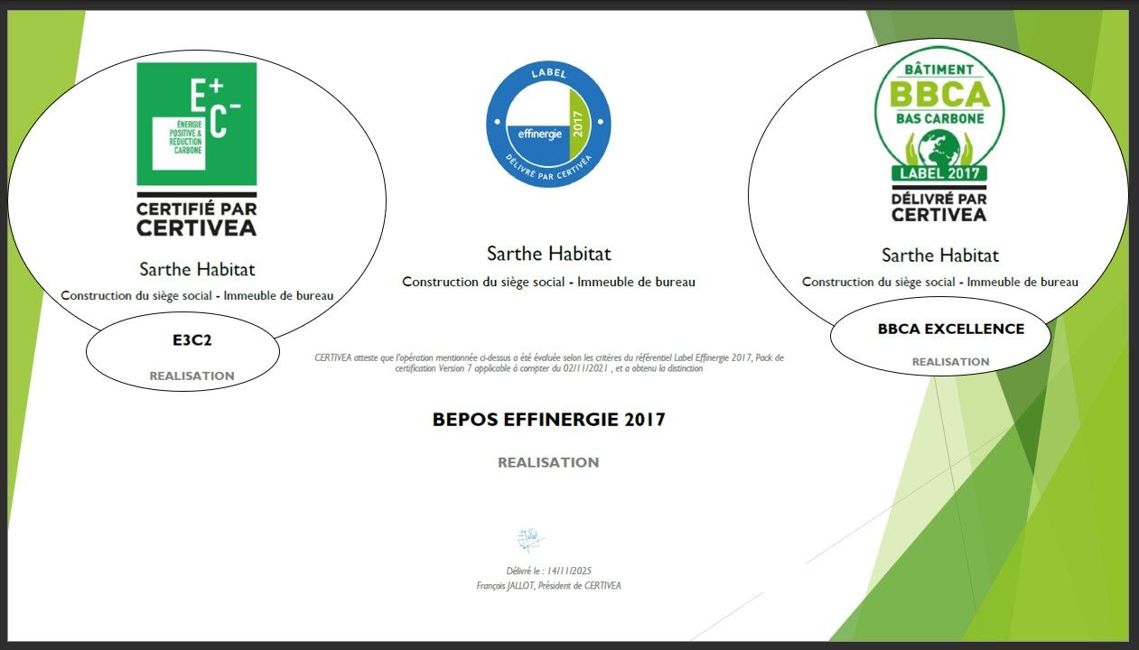 En collaboration avec Sarthe Habitat et l’ensemble des partenaires du projet, le nouveau siĂšge vient d’obtenir trois labels prestigieux dĂ©cernĂ©s par CERTIVEA :